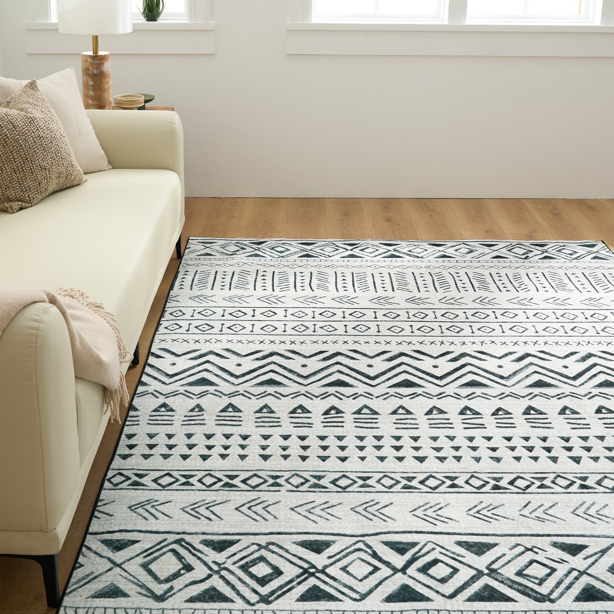 お手入れ簡単、洗えるラグ、モダンなトライバル、ミッドナイトフローデザイン、耐久性、こぼれ防止、ペットフレンドリー、滑り止めパッド、リビングルームエリアラグ