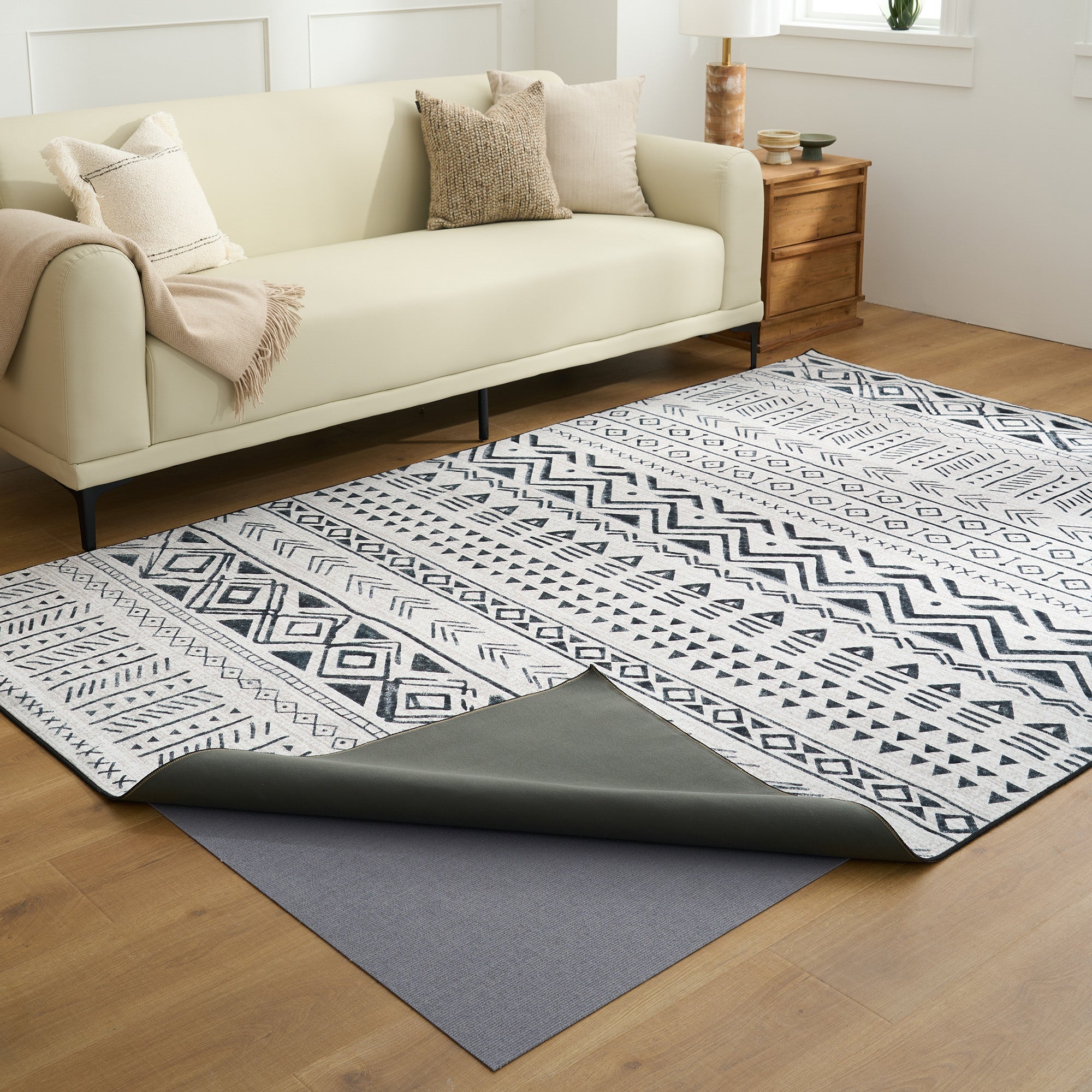 •取り外し可能なパッドでさらに保護:床とラグ本体の両方を保護します。パッドは簡単に洗えるので、人の出入りが多いご家庭やペットのいるご家庭でも、長く清潔な状態を保ちます。