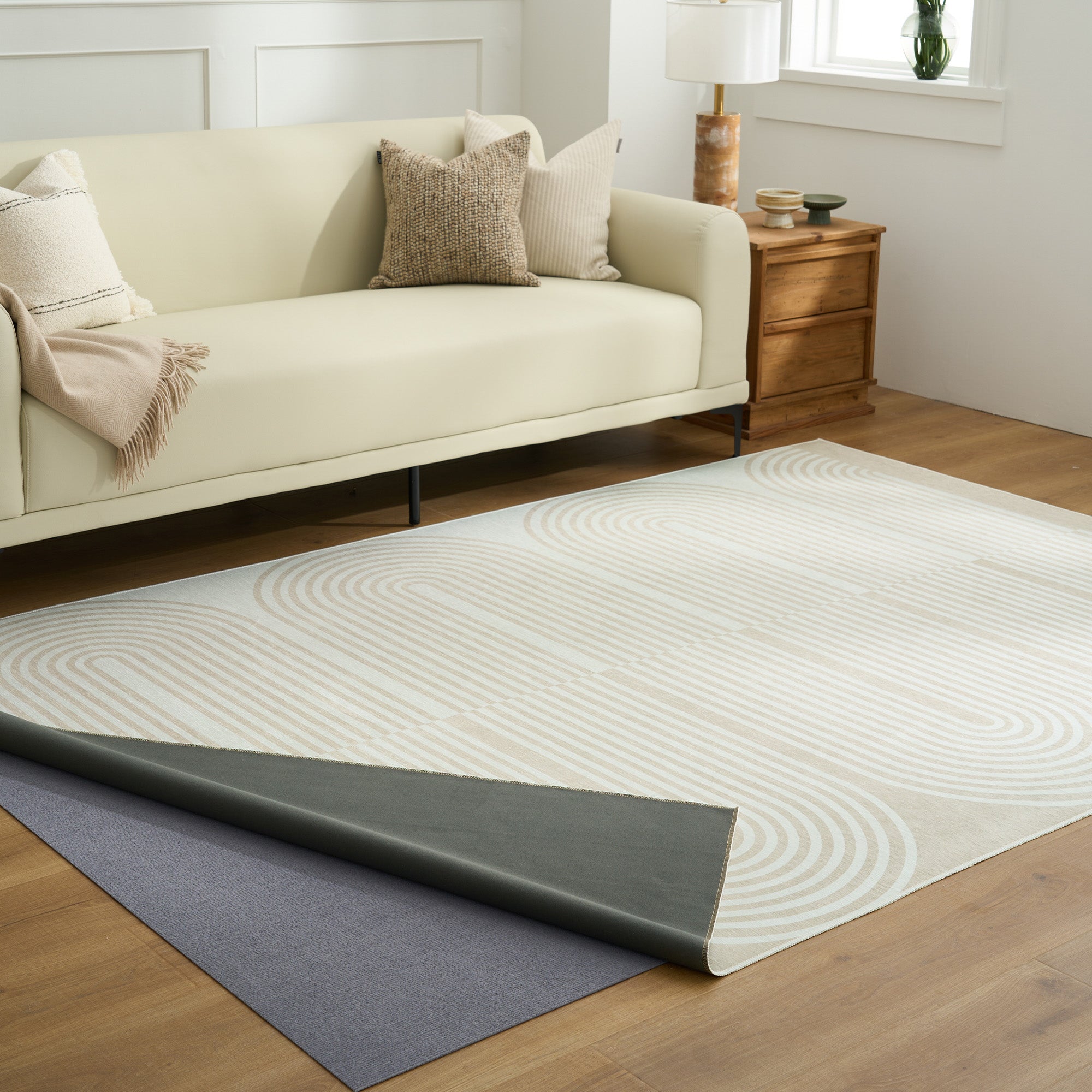 •取り外し可能なパッドでさらに保護:床とラグ本体の両方を保護します。パッドは簡単に洗えるので、人の出入りが多いご家庭やペットのいるご家庭でも、長く清潔な状態を保ちます。