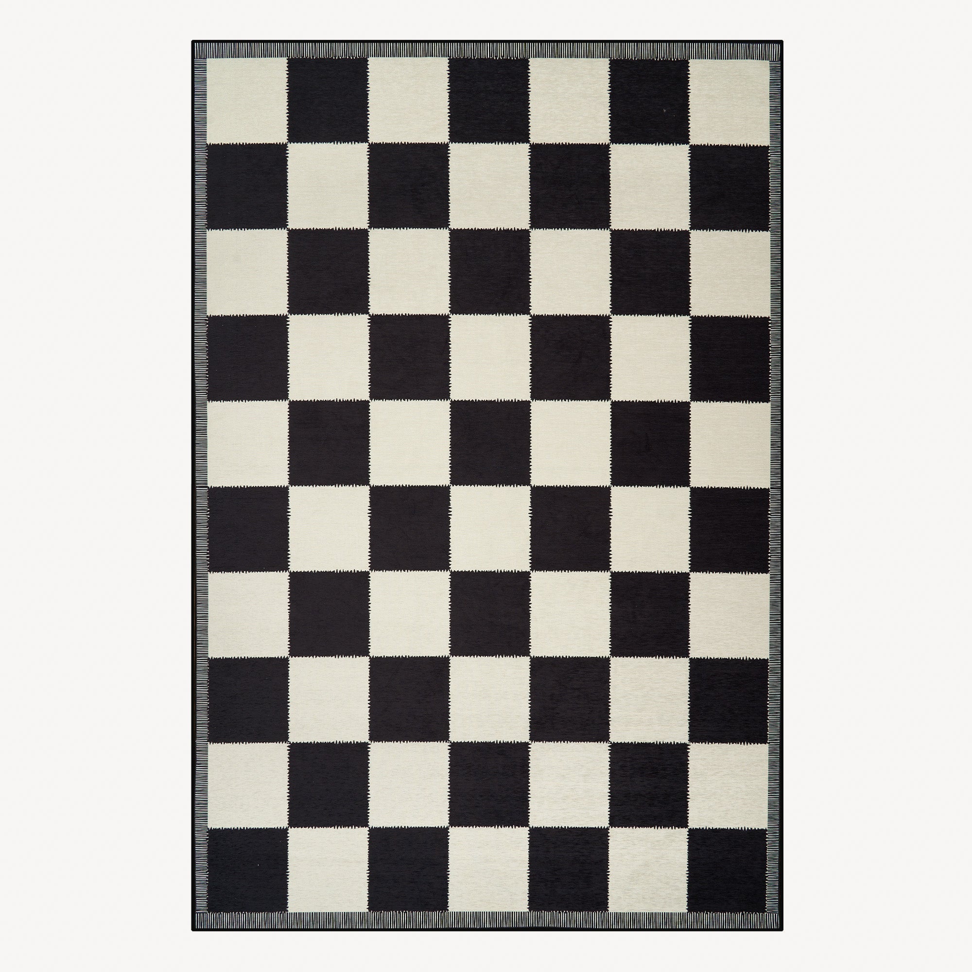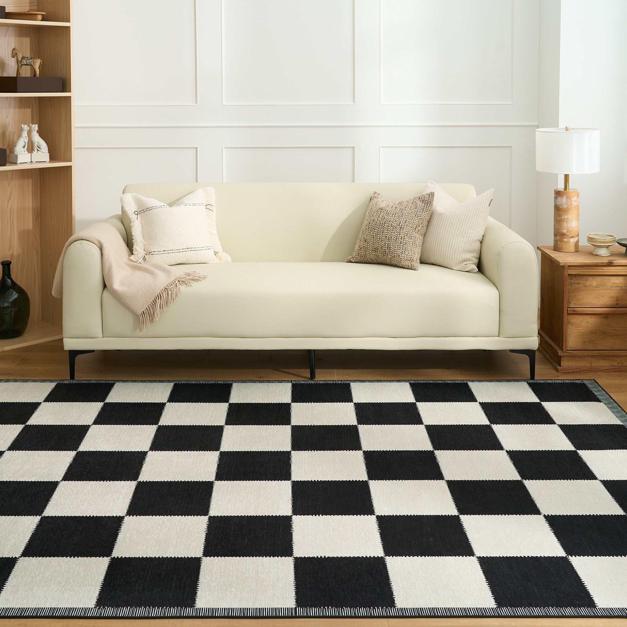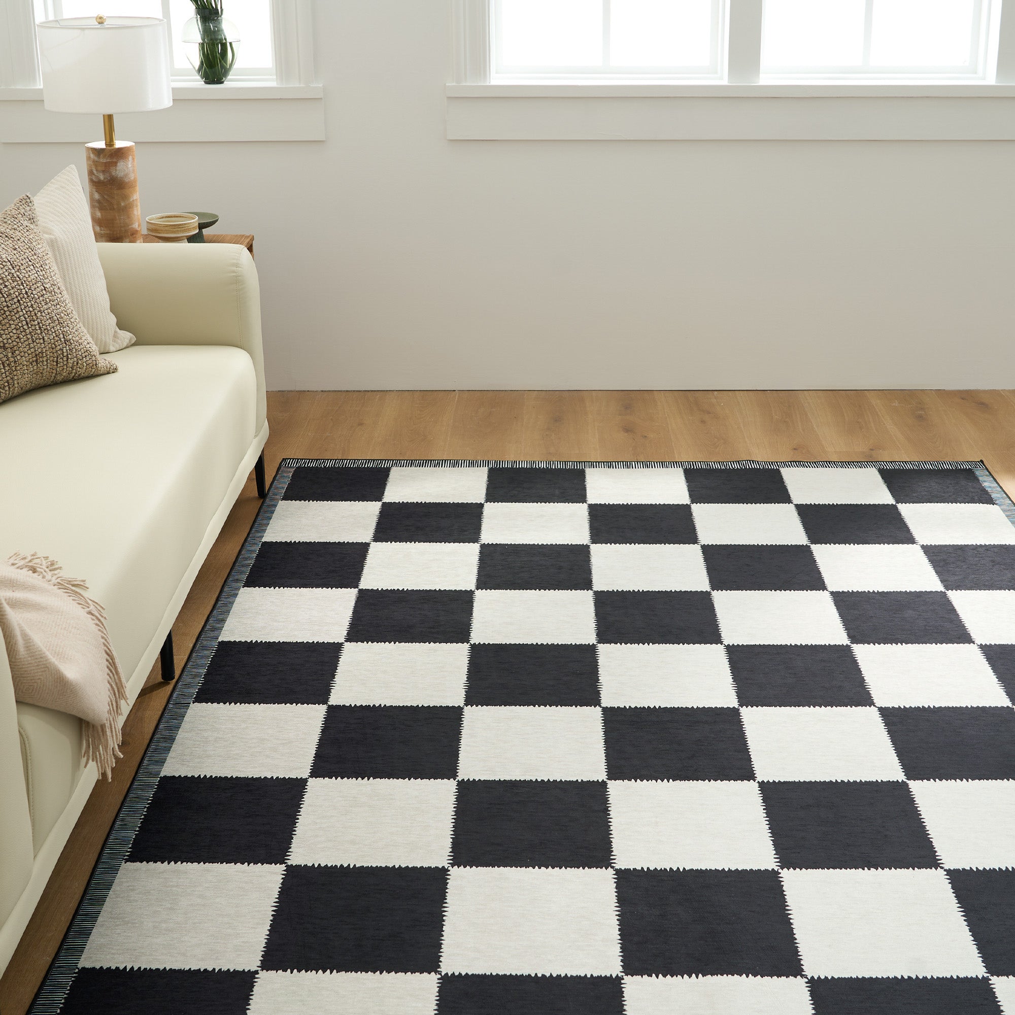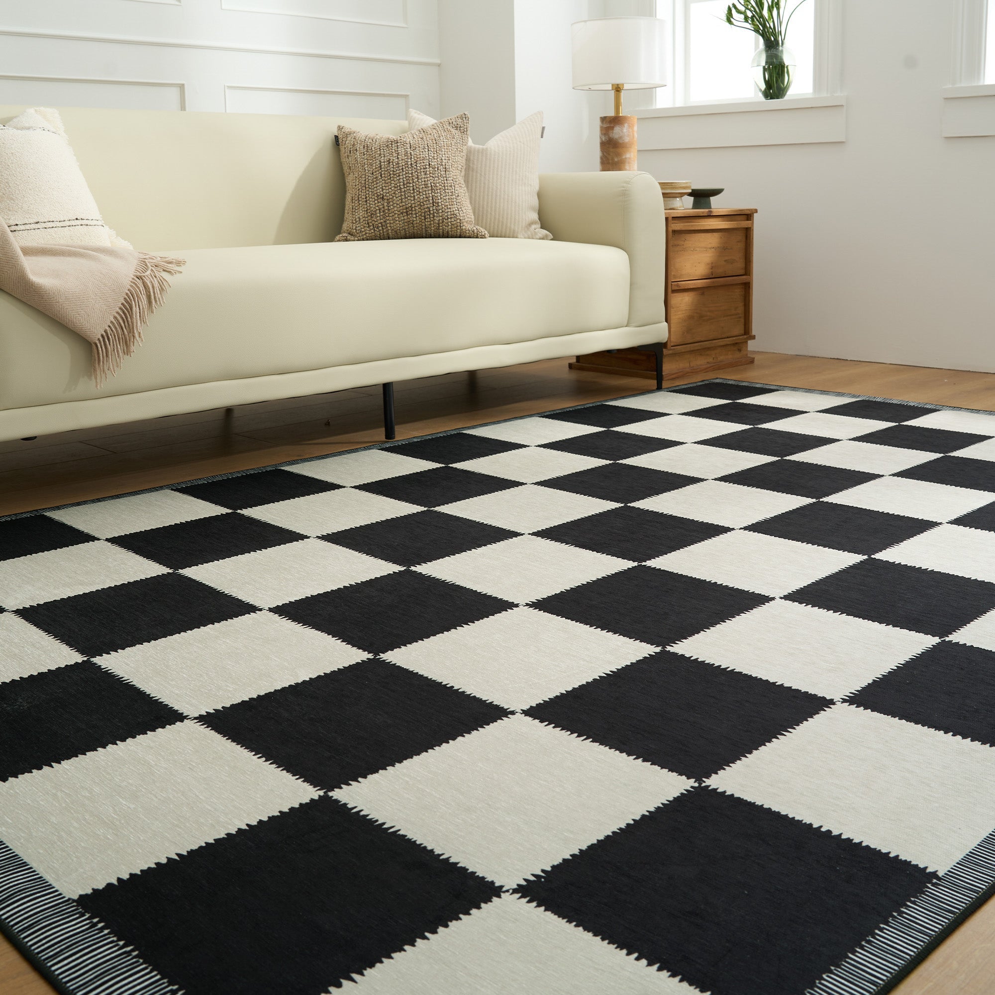 お手入れ簡単、洗えるラグ、タイムレスなノワールチェック柄デザイン、耐久性、こぼれ防止、ペットにも優しい、滑り止めパッド付き、リビングルームエリアラグ