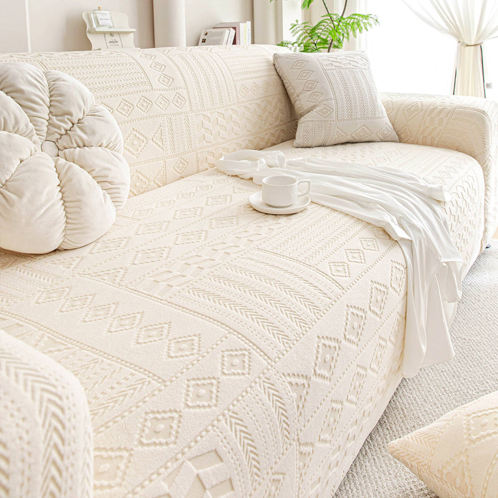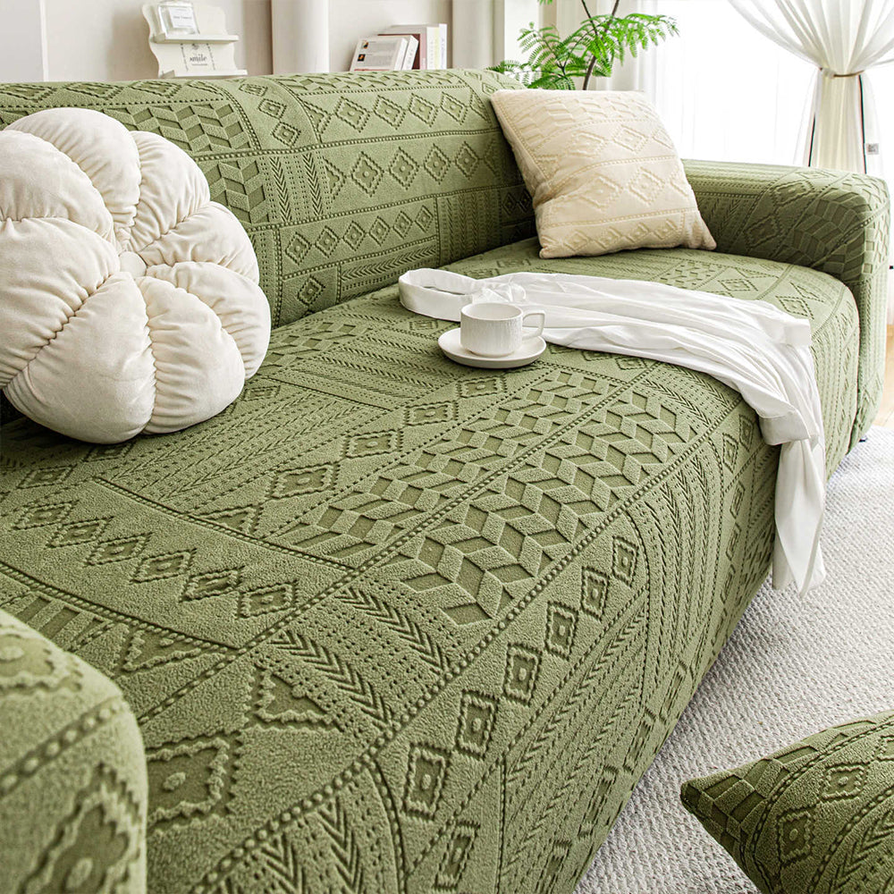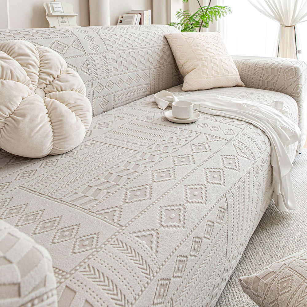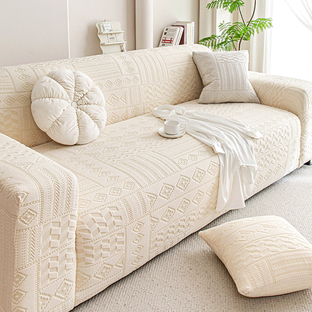 BohoWeaveストレッチ フルカバーソファスリップカバーで、空間をグレードアップ。ボヘミアンな風合いとモダンな機能性を洗練された形で融合させた逸品です。非常に柔軟な生地と精巧なエンボス加工が施されたこのカバーは、ソファを滑らかで立体的なカバーで包み込み、汚れ、ペットの引っかき傷、毛、そして日常の摩耗から守ります。ご家族、ペットを飼っている方、そしてスタイリッシュで清潔感があり、洗練されたインテリアスタイルを愛するすべての方に最適です。