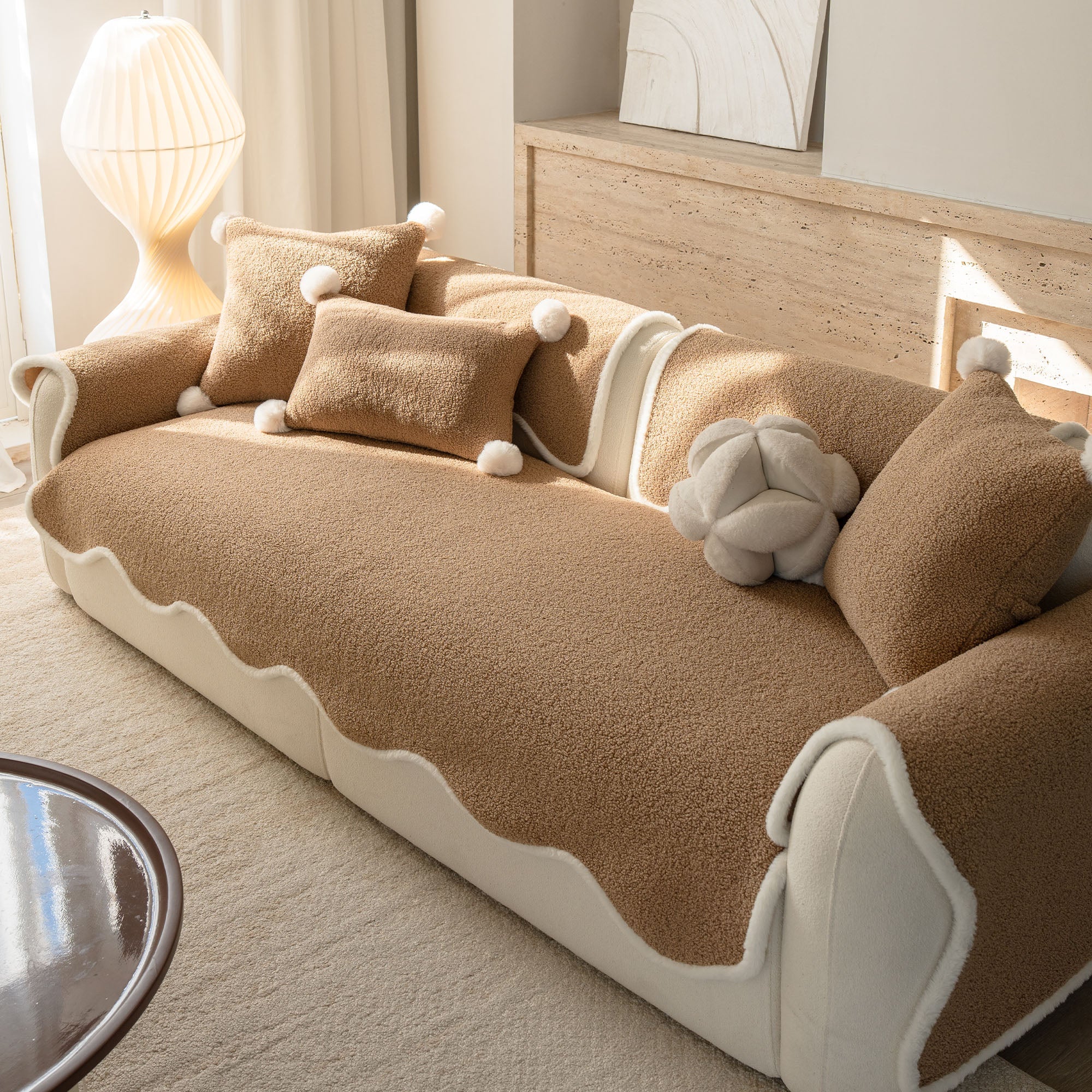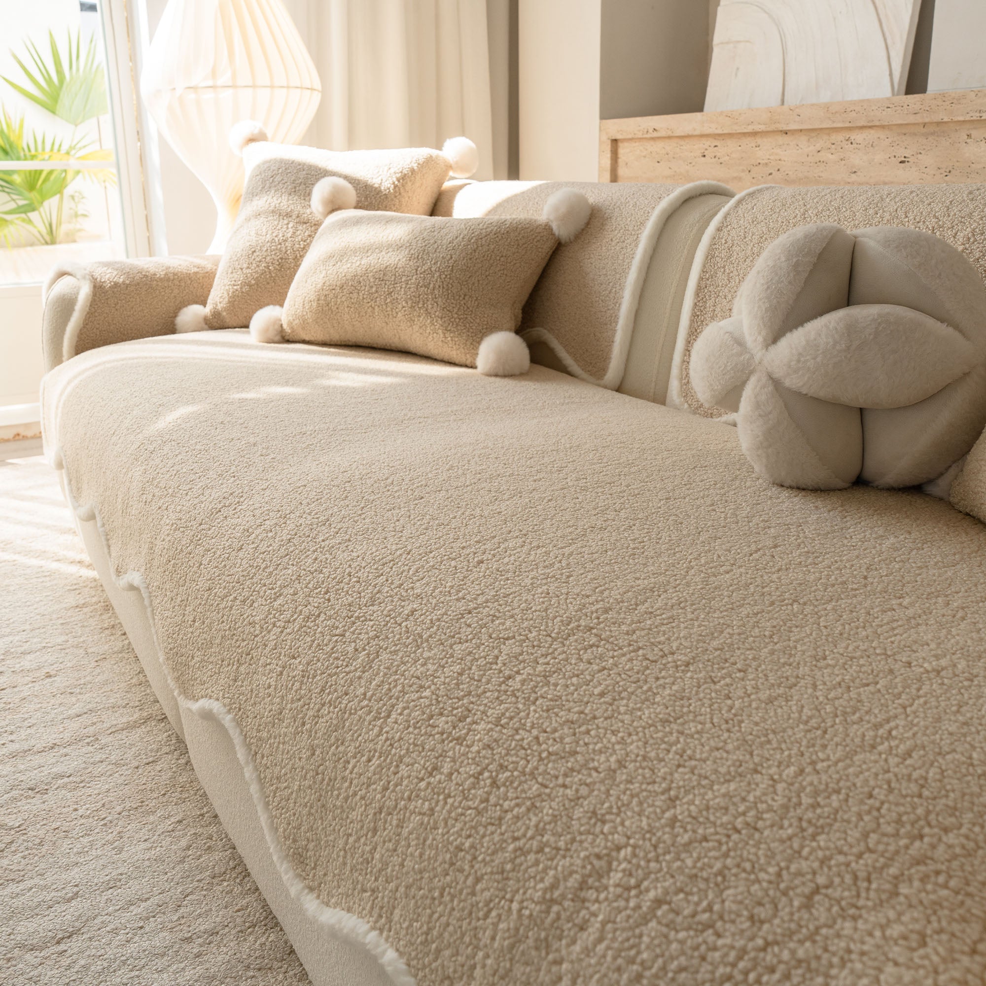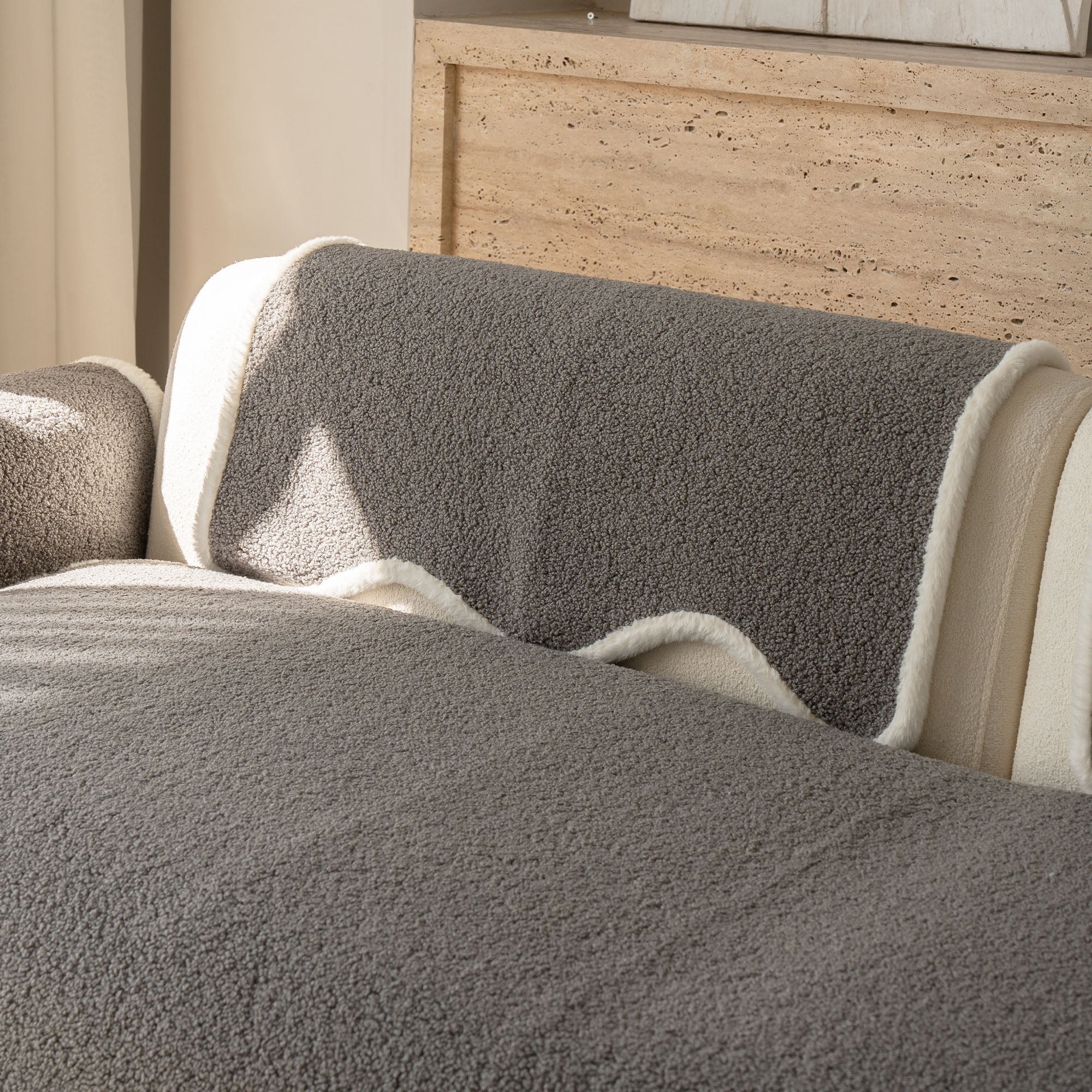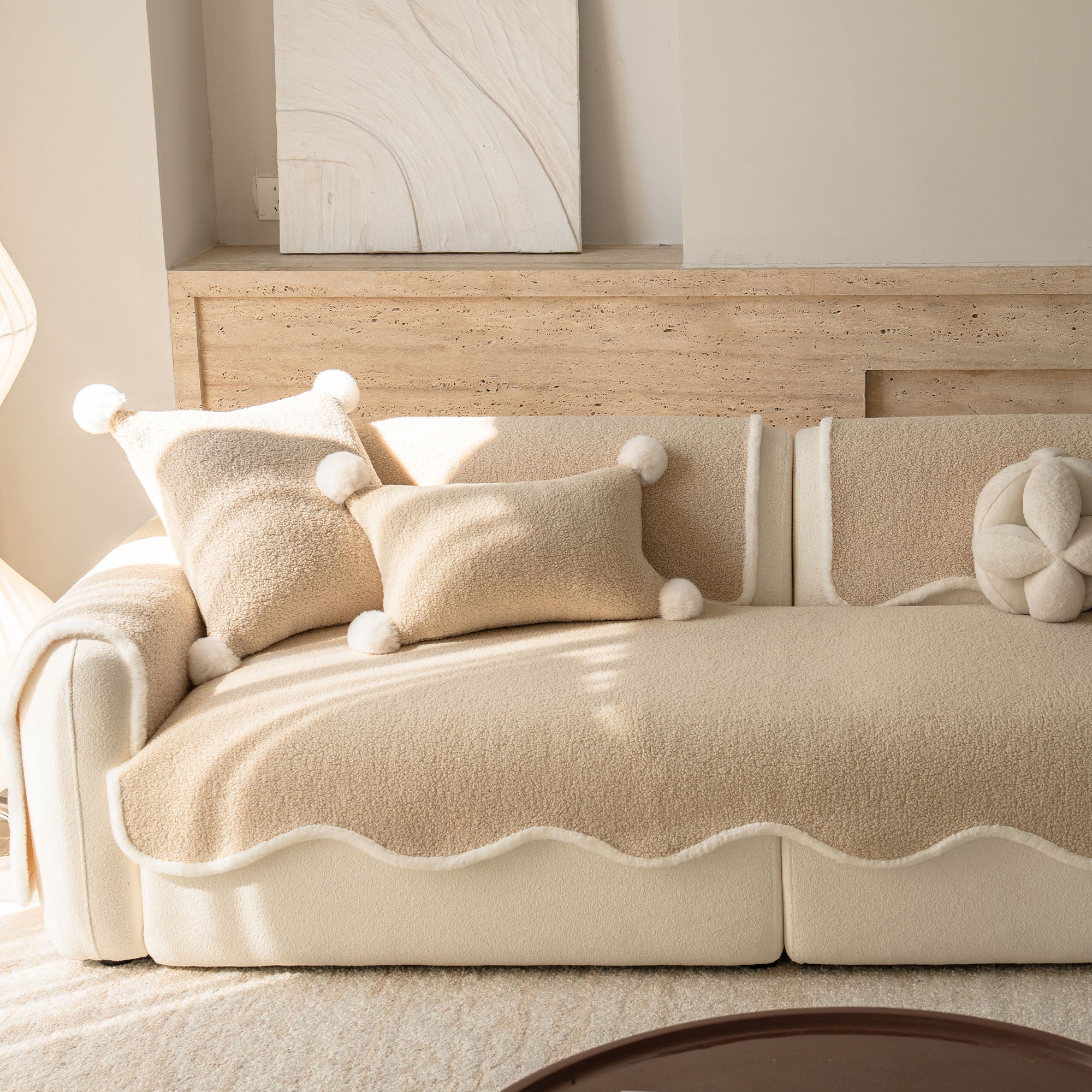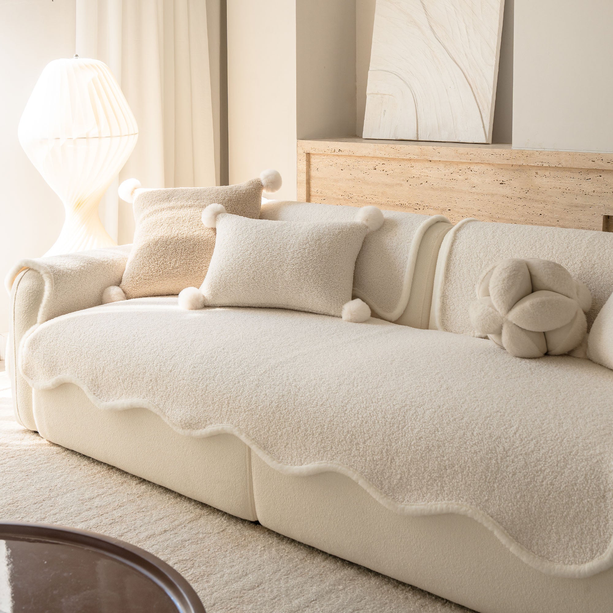 コージーシアリングシェルパノンスリップソファカバーで、ソファを静かな贅沢に包み込みましょう。高密度でふっくらとしたシェルパパイルは、まるで雲のように柔らかな肌触りで、秋冬を通して美しく着こなせます。しっかりとした滑り止め加工の裏地が、シートクッションやアームレストにしっかりとフィット。柔らかなスカラップ模様の縁が、洗練されたデザイナー仕上げを演出します。ペットやご家族にも優しく、髪の毛、傷、パンくず、日常のこぼれなどからソファを守ります。リビングルームはいつでもお客様をお迎えできる快適な空間です。