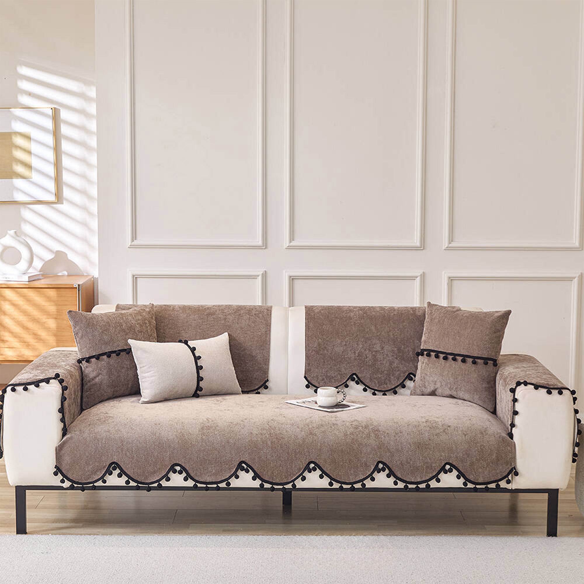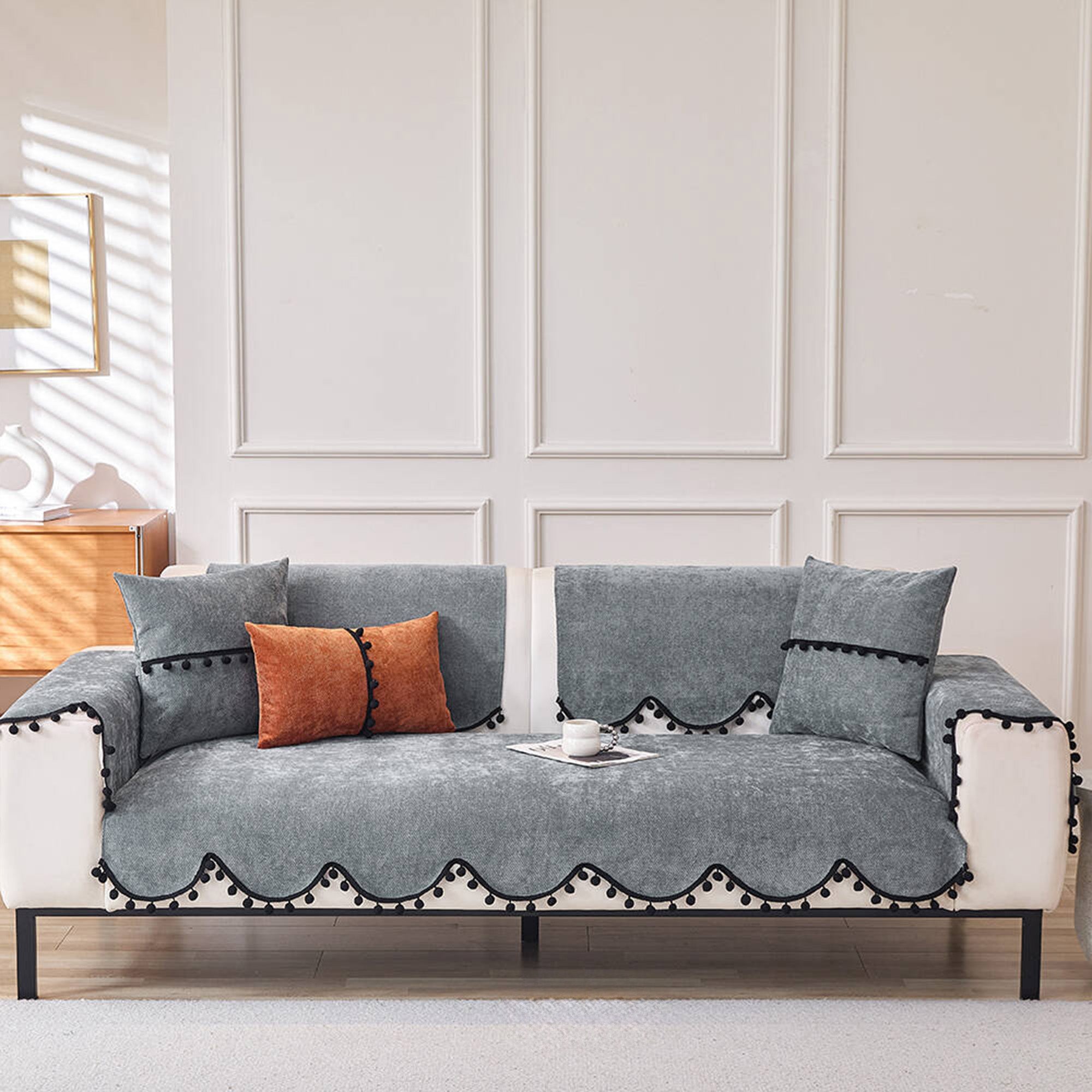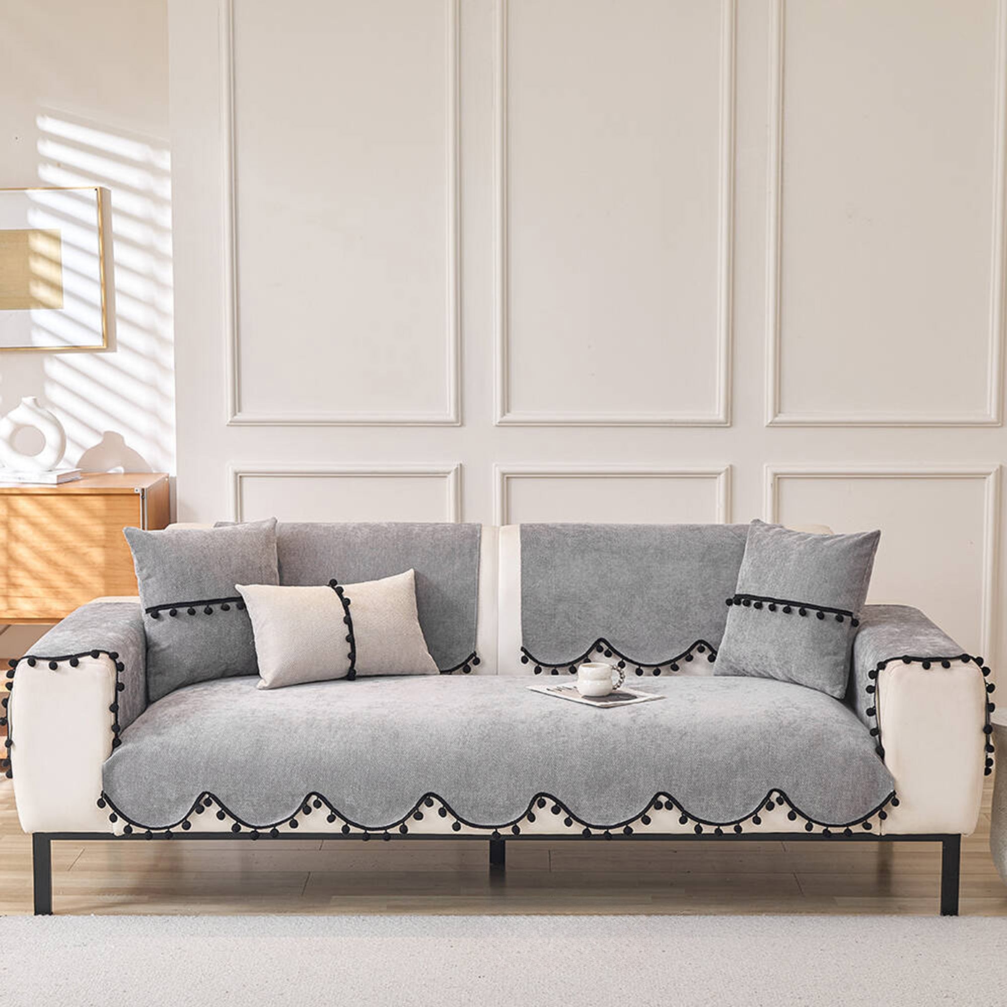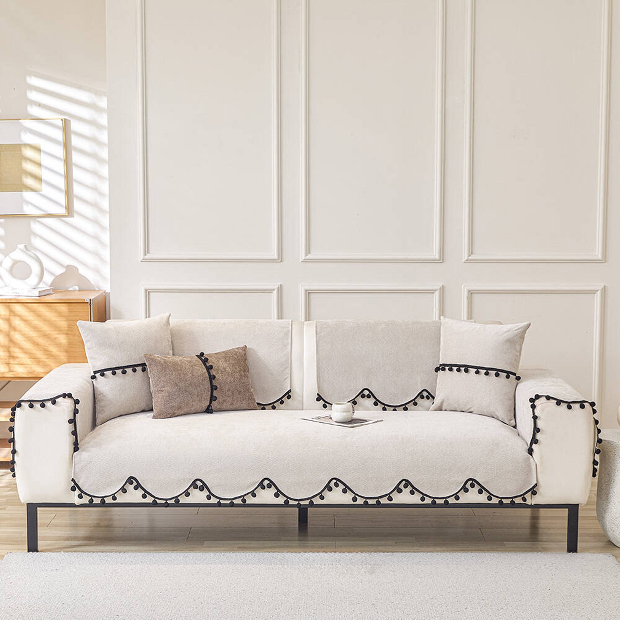 シックなスカラップ模様の裾と黒のポンポントリムが特徴の、トレンド感あふれるシェニール素材のカバーで、ソファをワンランクアップさせましょう。密度が高く毛足の短いシェニール素材は、贅沢な手触りでありながら耐久性にも優れ、滑り止め加工の裏地がすべてのパネルをしっかりと固定します。一年中お使いいただけるよう設計されており、ペットの引っかき傷、毛、こぼれ、そして日常の摩耗からソファを守ります。わずか数分で、清潔で快適なソファへのアップグレードを実現します。